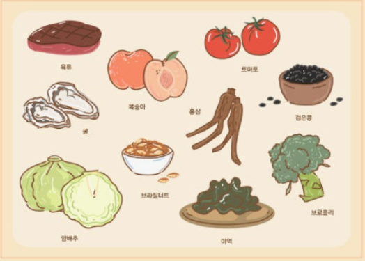 | 철분 | 에너지 생성 | 시금치, 소고기 |